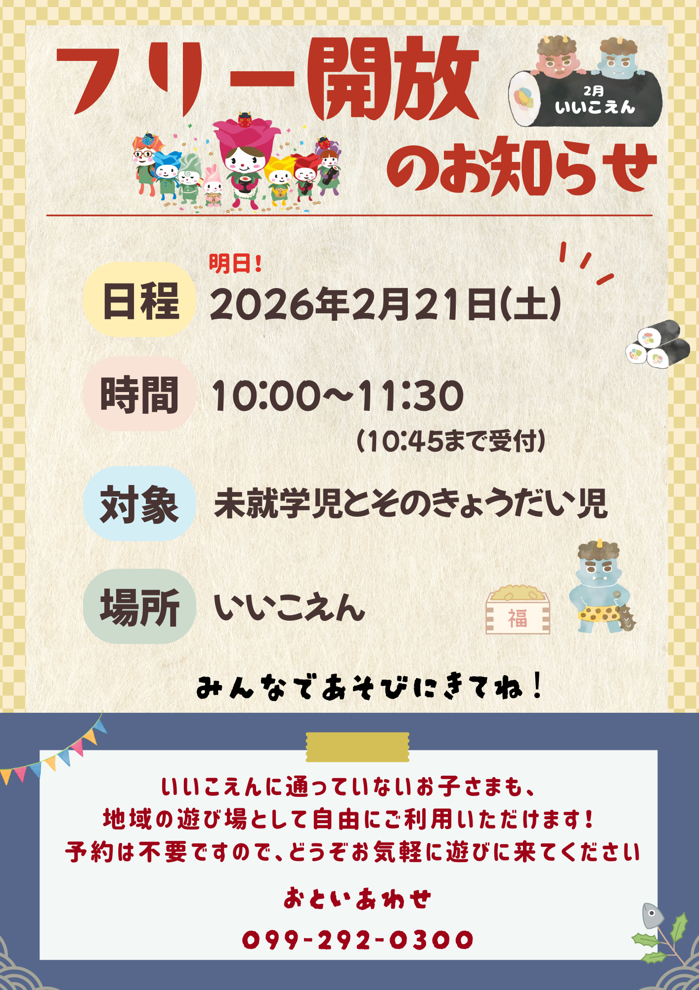 明日 2/21(土)は、いいこえんの施設を地域の遊び場としてフリー開放いたします!!